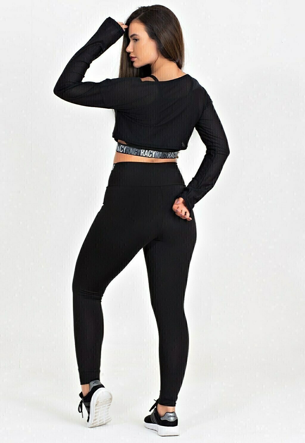 Look Total: Calça + Top + Cropped de Telinha (Para aquecimento ou dias frios).